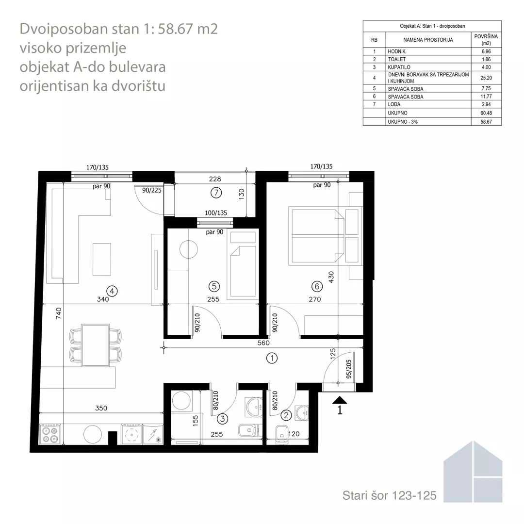 - Objekat A – stambeno-poslovni objekat spratnosti P+2+Pk, sa liftom, koji se nalazi uz ulicu Stari šor. Sadrži 17 stanova i 2 poslovna prostora.