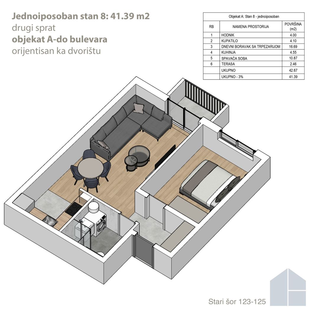 - Objekat B – višeporodični, dvorišni objekat spratnosti P+1+Pk, bez lifta, sa ukupno 12 stanova.