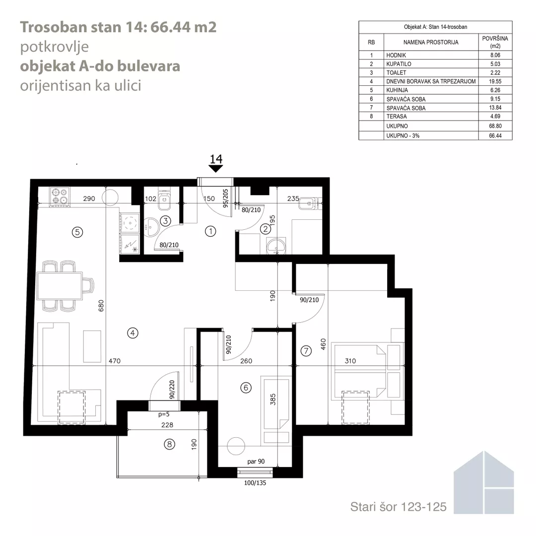 - Objekat A – stambeno-poslovni objekat spratnosti P+2+Pk, sa liftom, koji se nalazi uz ulicu Stari šor. Sadrži 17 stanova i 2 poslovna prostora.