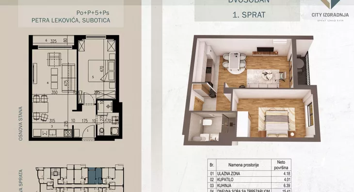 Višeporodično-stambeni objekat Po+P+5+Ps u ulici Petra Lekovića sa garažnim mestima u podumu i parking mestima u dvorištu objekta.