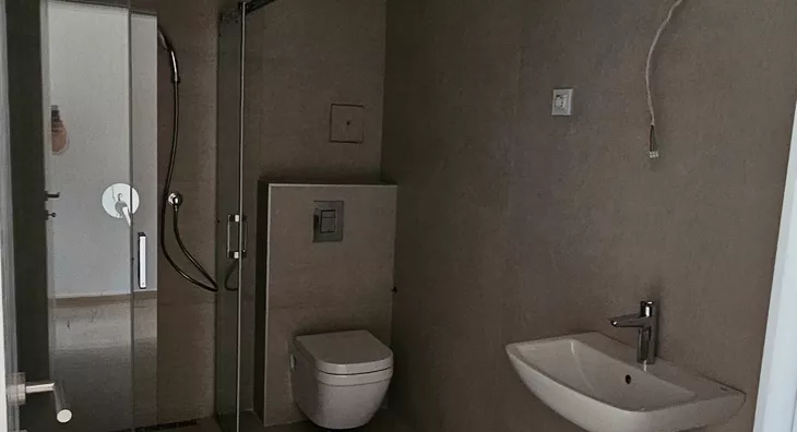 Sanitarije u kupatilima su vrhunski poznatog evropskog proizvođača GROHE. Konzolna masivna WC šolja, ugradni vodokotlić, ugradni tuš.