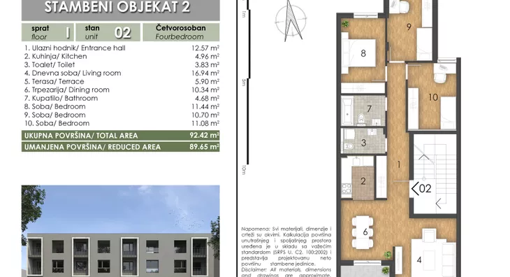 - Uz stan na drugom spratu dobija se gratis parking, ostava 10 m2 i krovna terasa u površini celog stana