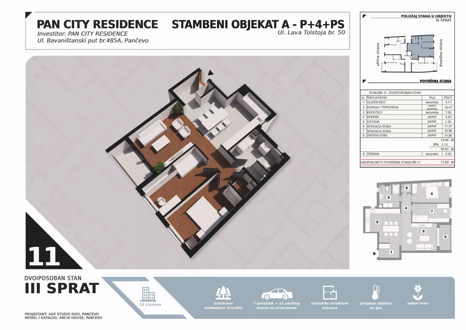 Stambeni kompleks "Pan City Residence" gradi se u naselju Tesla u najlepšoj ulici Lava Tolstoja, činiće ga dve zgrade sa 32 stana sa prelepim dvorištem, garažanim i parking mestima.