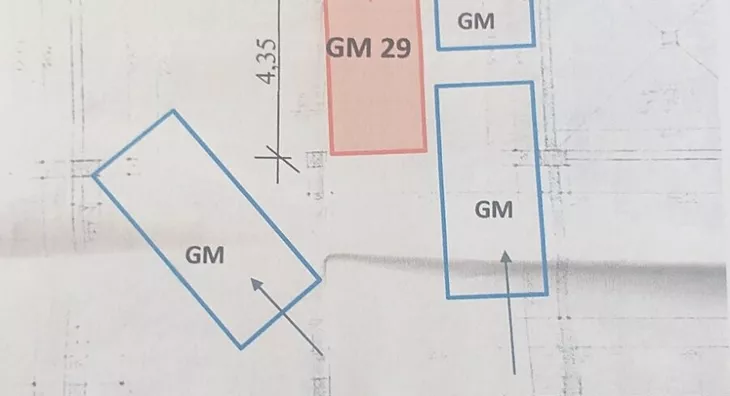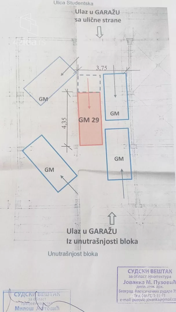 Površina je 12 m². Mesto je uže širina 1,75 m (sa manipulativnim prostorom 1,87m) tako da je pogodno za manji auto ili motor (ili dva motora).