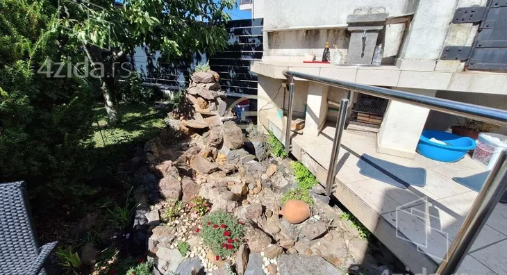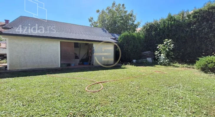Dvorište kuće je izuzetno lepo uređeno i u njemu se pored kuće nalazi garaža sa roll vratima na daljinski u sklopu koje se nalazi i dodatna ostava. Tu je i fontana, kao i zidani roštilj.
