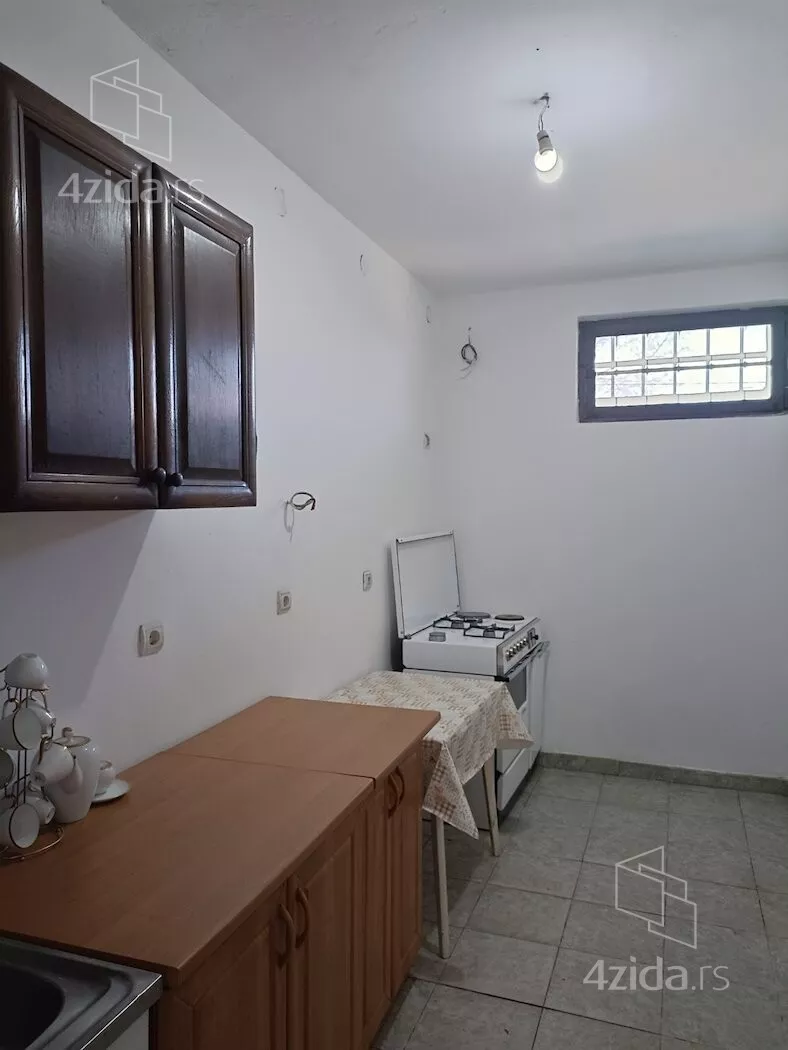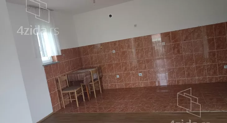 U prizemlju je jednosoban stan sa velikom sobom od 30 m2, kuhinjom i kupatilom, pogodno za lokal, market i sl. ili sa mogućnošću pregrađivanja i sa velikom terasom.