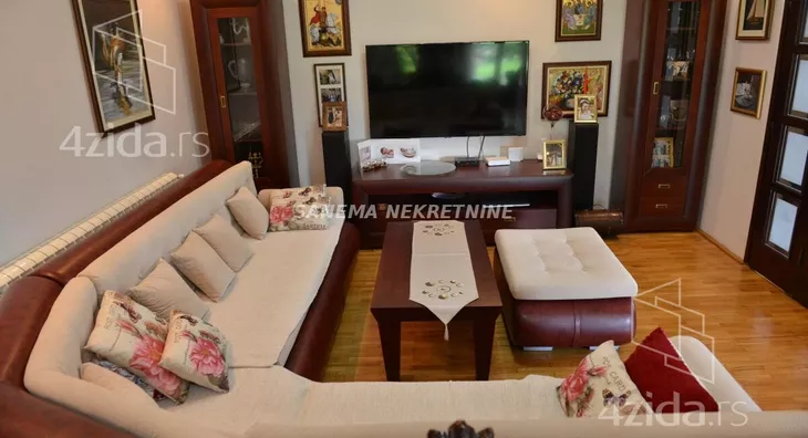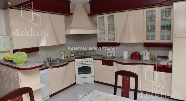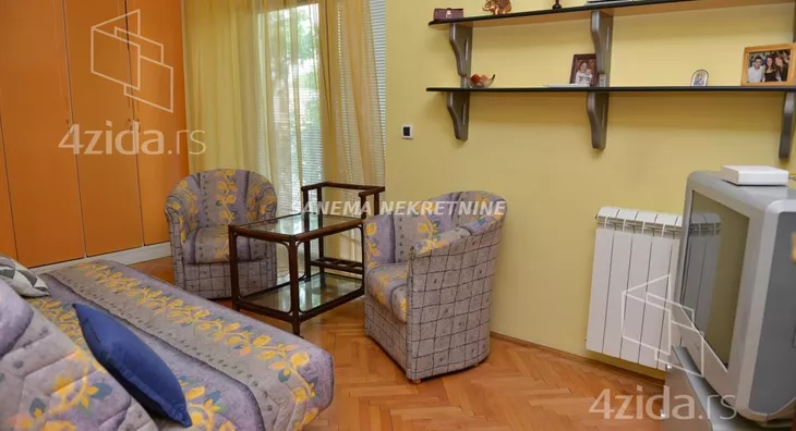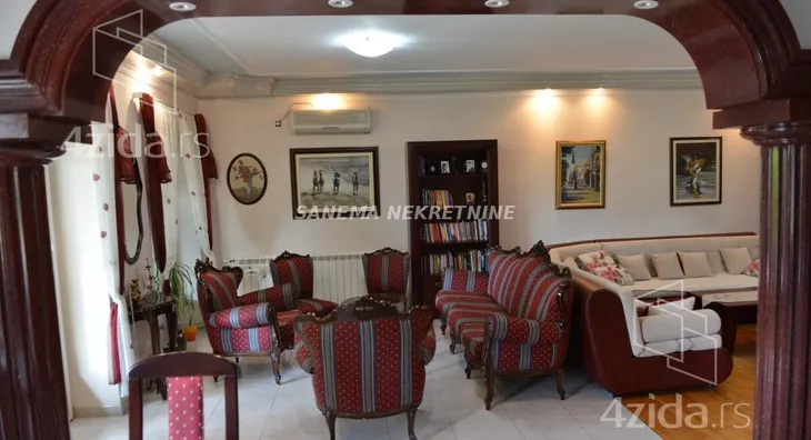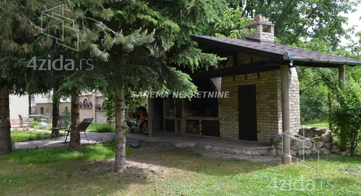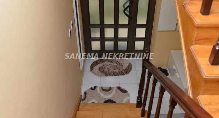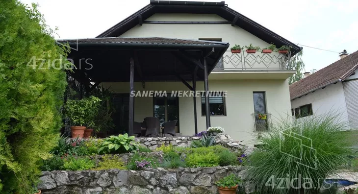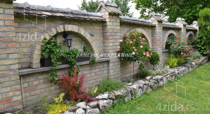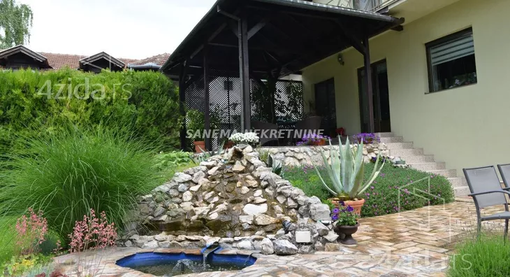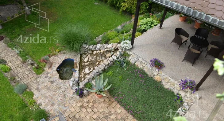 Sa obe strane kuće se nalaze ograđene terase. Dnevni boravak sa izlazom u dvorište povezan je predivno uređenom verandom, sa prostorom za sadnju cveća i fontanom.Kuća koja odiše mirom i prostorom danas tako potrebnim za odmor u krugu porodice.
