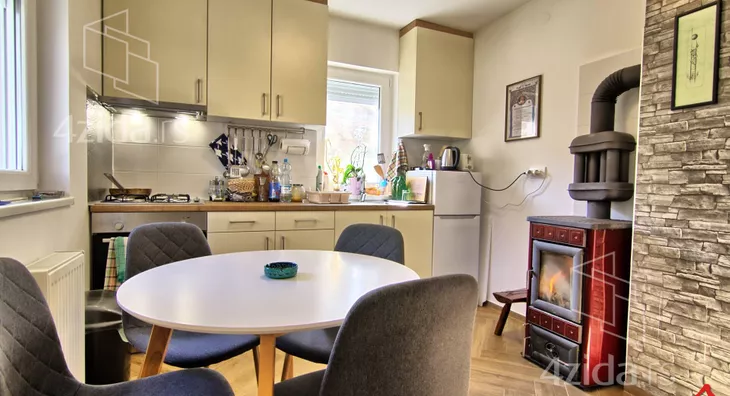The upper floor of the house includes a kitchen with a dining area (which has a solid-fuel stove for those who enjoy the crackling of a live fire), a spacious living room, a bedroom, and a bathroom. The lower level features a summer kitchen, a toilet, and a large room currently used as a storage area.