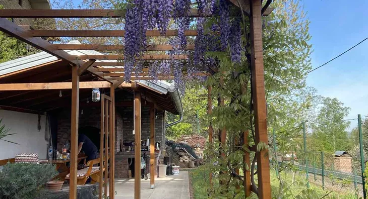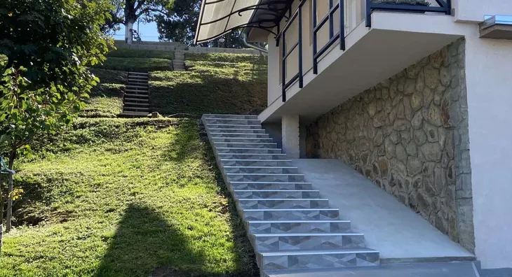 The plot is terraced, with rows of various fruit trees, has access from two different streets, plenty of parking space, and next to the house, there is a summer gazebo with a built-in barbecue, sink, and smokehouse.