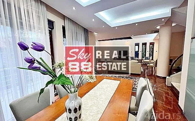 Savski venac , Dedinje , rezidencijalna zona , neposredna blizina Belog Dvora , Americke ambasade , 371m2 uknjizena kvadratura , 600m2 merena kvadratura , perfektna , luksuzna vila , gradnja 2005. godine ,cg / opcija gas , Pr+Vpr +1 +2 , vrhunski uredjen plac sa puno zelenila povrsine 6,37ari , Hrastov parket 1. klase , Alu drvo stolarija , motorne roletne , sanitarije Hans Grohe , Armal i Geberit , Italijanska keramika , mermerno stepeniste sa ogradom od inoxa , visina plafona 2,8m - 4m , kamin , bazen 12m X 4m , garaza za dva vozila ....dizajnerski uredjena vila odise harmonijom i luksuzom , prodaje se kompletno opremljena , odmah useljiva . Struktura - Vpr ( visina 1. sprata ) - ulazni antre , prostrana dnevna soba sa trpezarijom i kaminom , izlazom na terasu povrsine 10m2 ( sa koje se stepenicama spusta u dvoriste ) , kuhinja , master spavaca soba ( sa kupatilom ) , toalet , garaza . 1. sprat - dve spavace sobe , galerija / radni prostor , kupatilo . 2. sprat - master spavaca soba sa kupatilom , garderoberom i izlazom na terasu povrsine 50m2 . Npr - ostava , laundry , tehnicka prostorija , gym , hoby prostor sa izlazom na dvoriste sa bazenom , studio ( spavaca soba , kuhinja , kupatilo ) , kupatilo . Agencijska provizija 2%