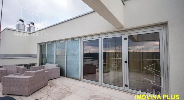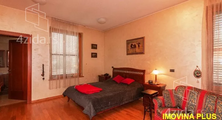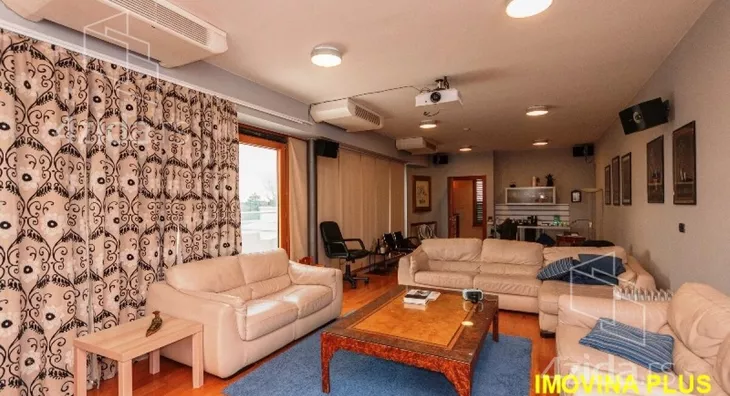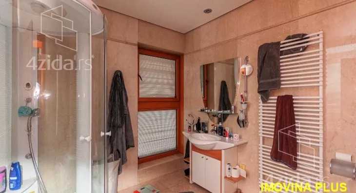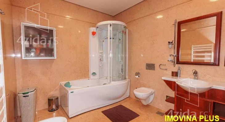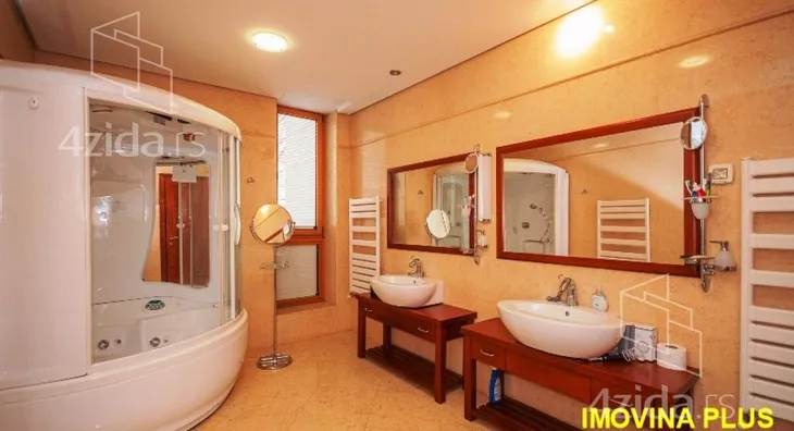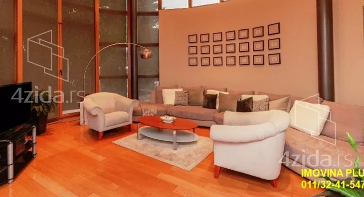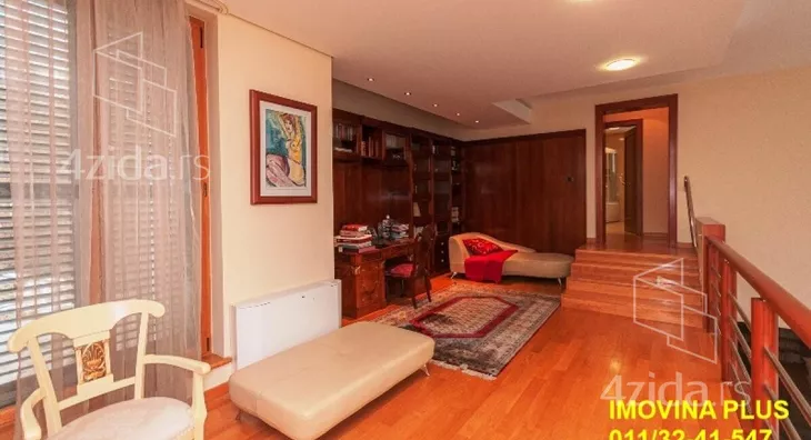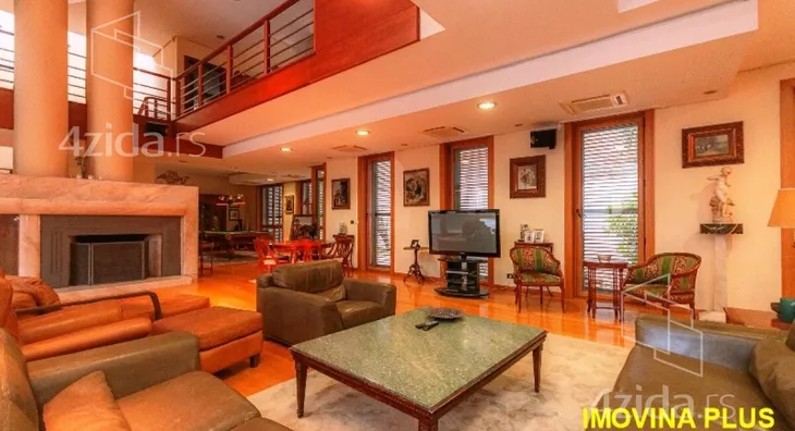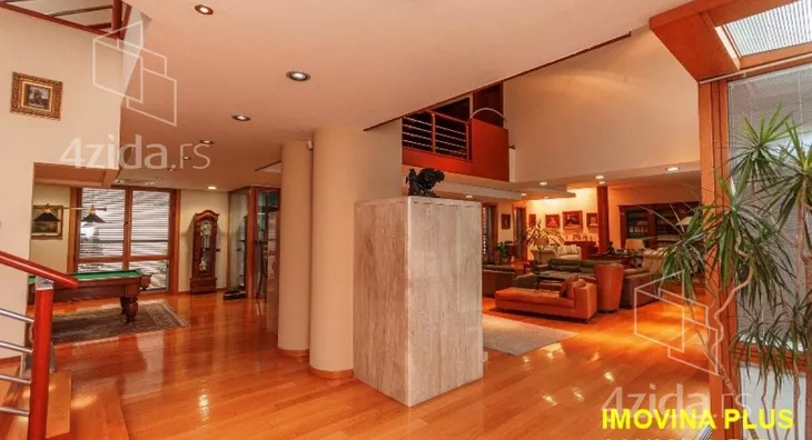 Ekskluzivna nekretnina na izuzetnoj lokaciji. Moderno arhitektonsko rešenje sa primesama klasičnog u enterijeru. Ogroman dnevni boravak u kome dominira veliki mermerni kamin. Duž celog dnevnog boravka su veliki prozori koji imaju pogled ka bašti. Tu se nalazi i bilijar sala. Velika kuhinja i trpezarija, prostor predviđen za odmor (manji dnevni boravak), kupatilo i garderober. Iz dnevnog boravka stepenice vode ka galeriji sa radnom sobom. Četiri spavaće sobe, svaka ima svoje kupatilo i dve sa zasebnim garderoberom. Na trećem nivou nalazi se prostor predviđen za filmske projekcije (bioskop ) sa izlazom na prelepu terasu. U donjem nivou nalaze se pomoćne prostorije, zaseban stan (predviđen za poslugu), prostrana garaža za dva automobila + tri garažna mesta u dvorištu. Kuća ima i SPA centar i veliki zatvoreni bazen dubine 2m.