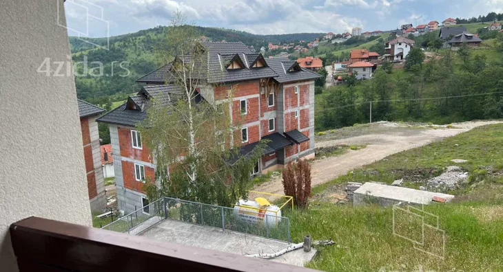 Novosagrađena stambena zgrada u mirnom kraju na Zlatiboru, naselje Gajevi, suteren, prizemlje i potkrovlje, sa 5 azasebnih apartmana.Ap. 1, je veći dvosoban, pov.76,31 m2, ap.2. je manji dvosoban, pov.40,21 m2, ap.3. je garsonjera pov.28,11 m2 bez terase,, ap.4 je manji dvosoban stan pov.39,37 m2 i ap.5 je veća garsonjera sa terasom pov.33,30 m2. Apartmani su kompletno opremljeni, nameštajem i tehničkim uređajima..