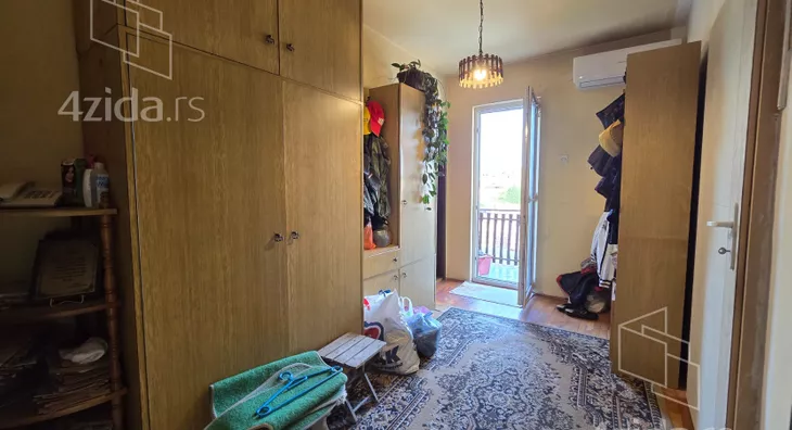 Na spratu se takođe iz hodnika ulazi u sve prostorije, a poseduje odvojenu kuhinju sa trpezarijom, dve spavaće sobe i manju terasu.