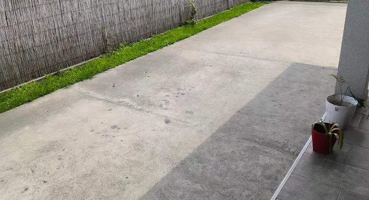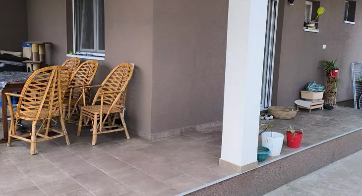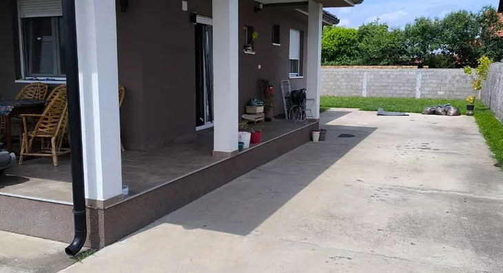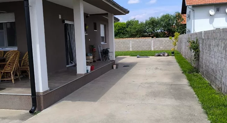 Kuhinja izlazi na terasu koja vodi na donji deo dvorišta, dok postoji i veća , glavna ( ulazna ) terasa koja se nalazi sa prednje strane koja hodnikom vodi u centralni deo kuće. Kuća ima dve spavaće sobe, svaka od njih ima svoje kupatilo i gardarober, s tim da postoji i dodatni wc i gardarober u centralnom delu kuće.