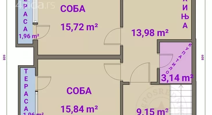 Kuća je uknjižena na 59m2, mereno ima ukupno 135m2.