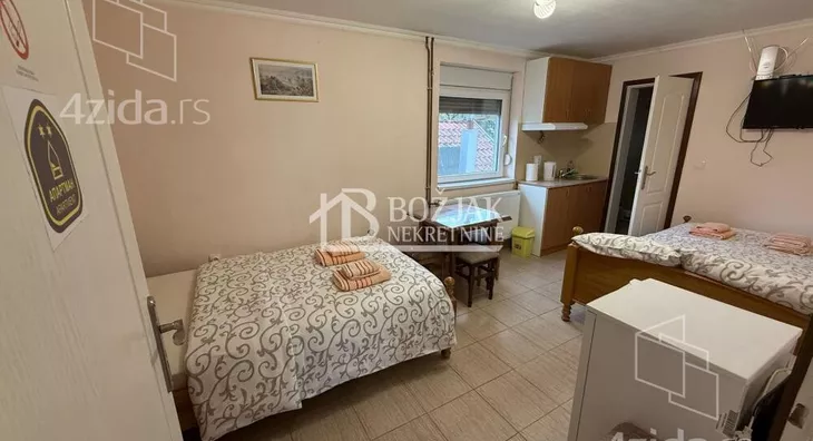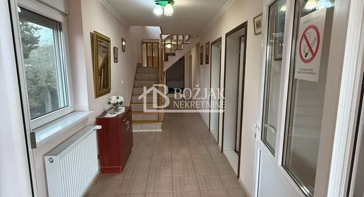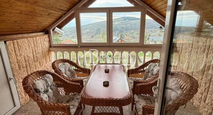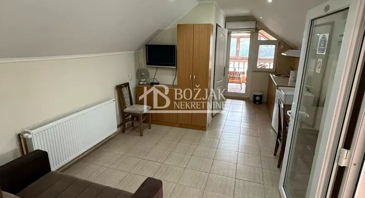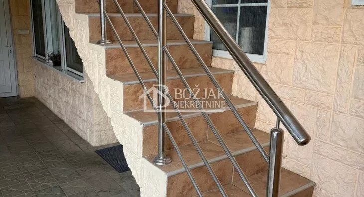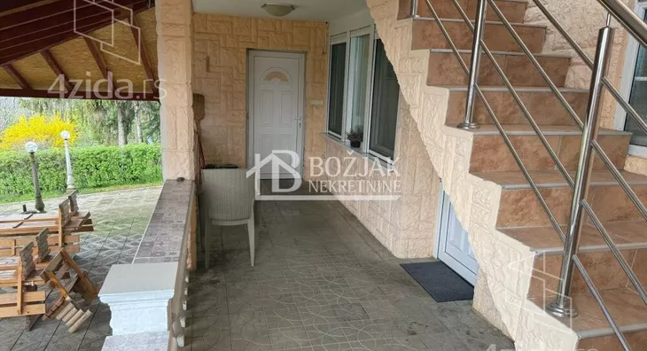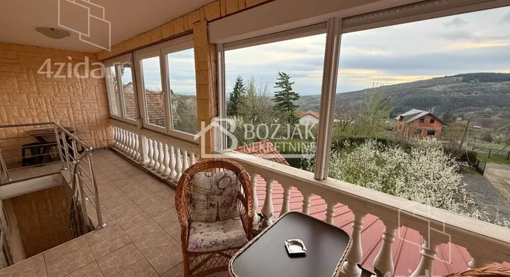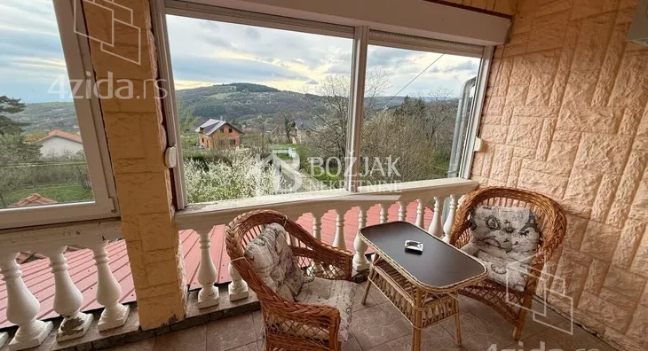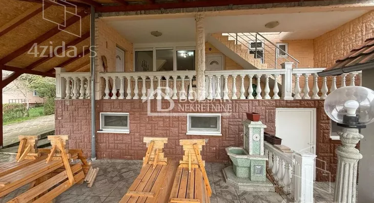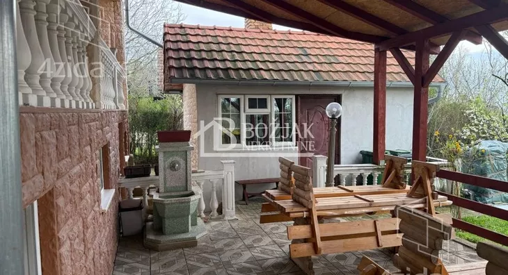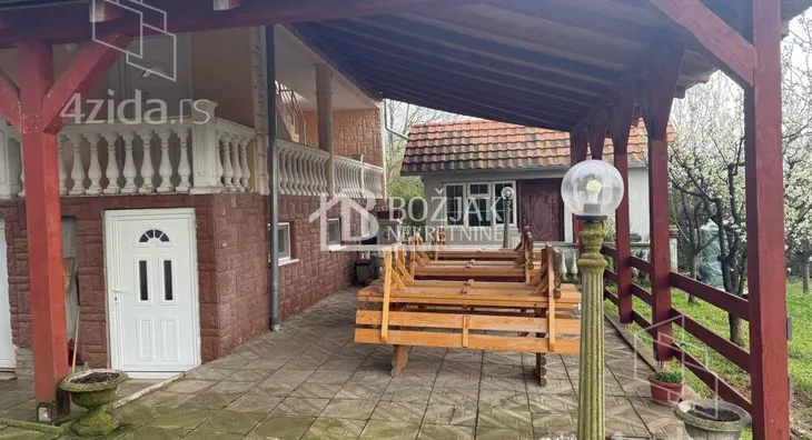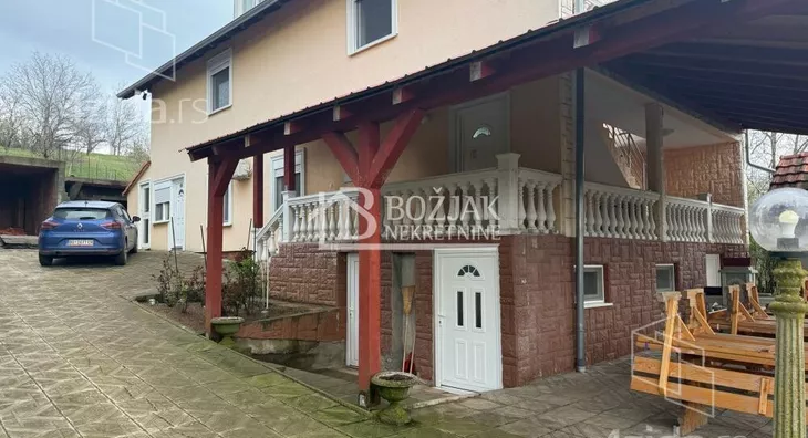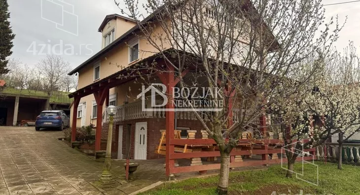 Prodaje se vikend kuća koja se od centra Jazka nalazi na 2 km. Kuća je površine 148m2 sa pomoćnom prostorijom od 14m2, na placu od 899m2. Kuća se sastoji od suterena, prizemlja, sprata i potkrovlja. Kuća ima šest apartmana, tri manja (za dve osobe), dva veća (za četiri osobe) i jedan veliki (za pet osoba). Svi apartmani imaju sobu, kuhinju, kupatilo i terasu, neki imaju zajedničku,a najveći apartman ima svoju. U suterenu su tri prostorije - garaža, letnja kuhinja i ostava. U prizemlju je deo sa dnevnom sobom, kuhinjom, dve spavaće sobe i kupatilom i jedan apartman. Na prvom spratu su četiri apartmana i najveći je u potkrovlju koji ima dnevnu sobu, spavaću sobu, kuhinju kupatilo i terasu. Apartmani su opremljeni nameštajem, kuhinje su opremljene uređajima, TV je u svakom. Uz kuću je velika natkrivena terasa. Pored kuće je pomoćni objekat u kome su roštilj i kupatilo. Vlasnici su izdavali apartmane preko Booking-a, ocena je bila 4,7. Grejanje je centralno na pelet. Hlađenje je na klime. Kuća je novije gradnje, stolarija je PVC, na podovima su pločice. U dvorištu je veliki parking za pet automobila, započeta je izgradnja garaže, do ploče. Dvorište je ograđeno živom ogradom, a iza kuće je mali voćnjak sa dvadesetak stabala. Struja je trofazna, postavljena su dva vodomera, a kuća ima i sopstveni bunar. Vlasnik 1/1, bez tereta. Agencijska provizija 2%
