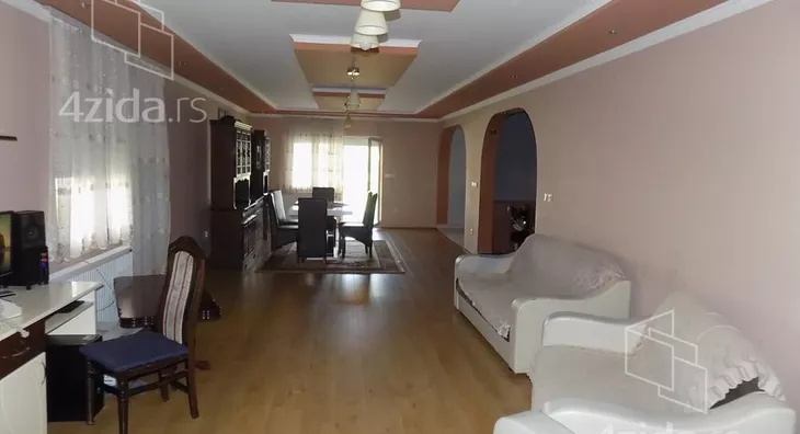 U prizemlju su veliki dnevni boravak sa kuhinjom, kupatilo, dve spavaće sobe i velika terasa, a na spratu su šest spavaćih soba(jedna je velika pa može biti dnevni boravak ), kupatilo i terase. Grejanje na čvrsto gorivo(veliki kotao i radijatori), izolacija 10cm stiropor, fasada, PVC stolarija, gradska voda, trofazna struja, sengrup, dve pumpe u dvorištu. Ima i veliki pomoćni objekat sa garažom, letnjom kuhinjom, velikom šupom, oborom i još jednom prostorijom. U neposrednoj blizini je autobuska stanica, a i prodavnica, crkva i škola nisu mnogo udaljeni.