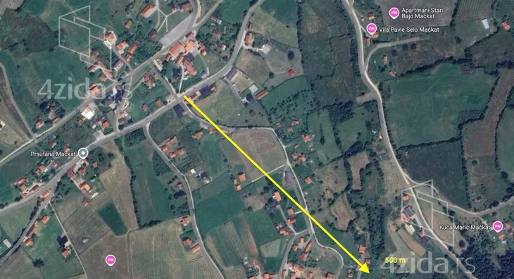 Tradicionalna srpska kuća sa okućnicom u širem centru Mačkata. Velika parcela na vrhu brega sa odličnim pristupom (asfaltni put), lepom okolinom i divnim pogledom. Čuvene kafane iz centra Mačkata udaljene samo 500 m, crkva 600 m. Objekti su legalni, evidencija u katastru ažurna. Cena placa sa kućom niža je od prosečne cene placeva bez kuće.