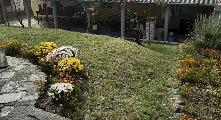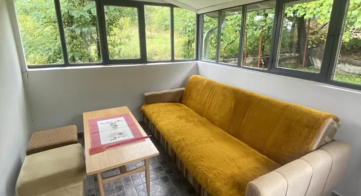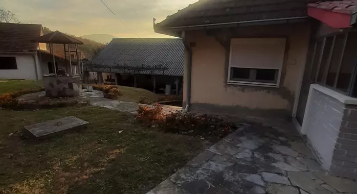 Kuća 1 (desno od ulaza) ima 78m2 plus 2 podrumske prostorije uvedenom strujom, vodom i izgradjenim kupatilom i zastakljenom verandom.