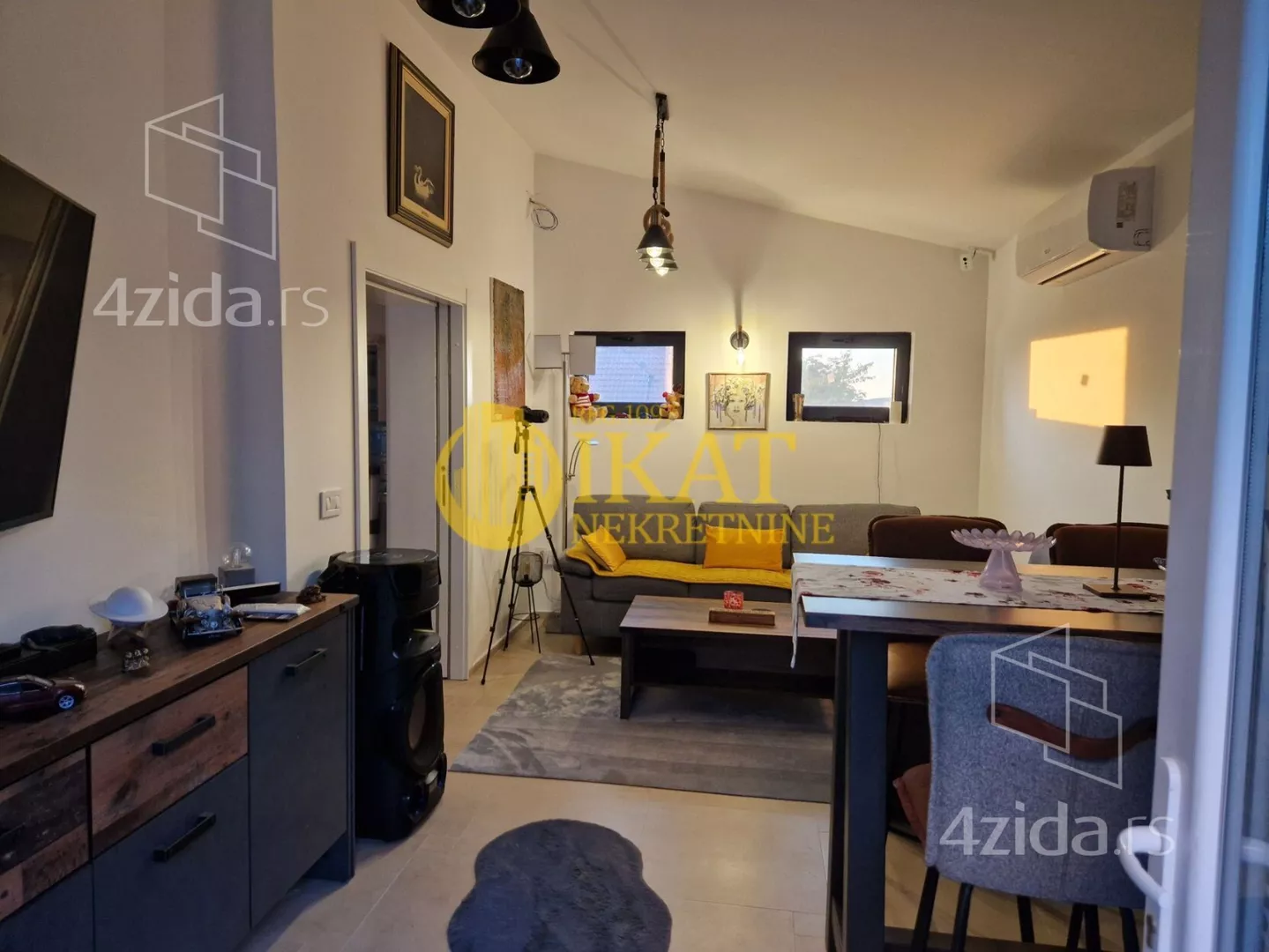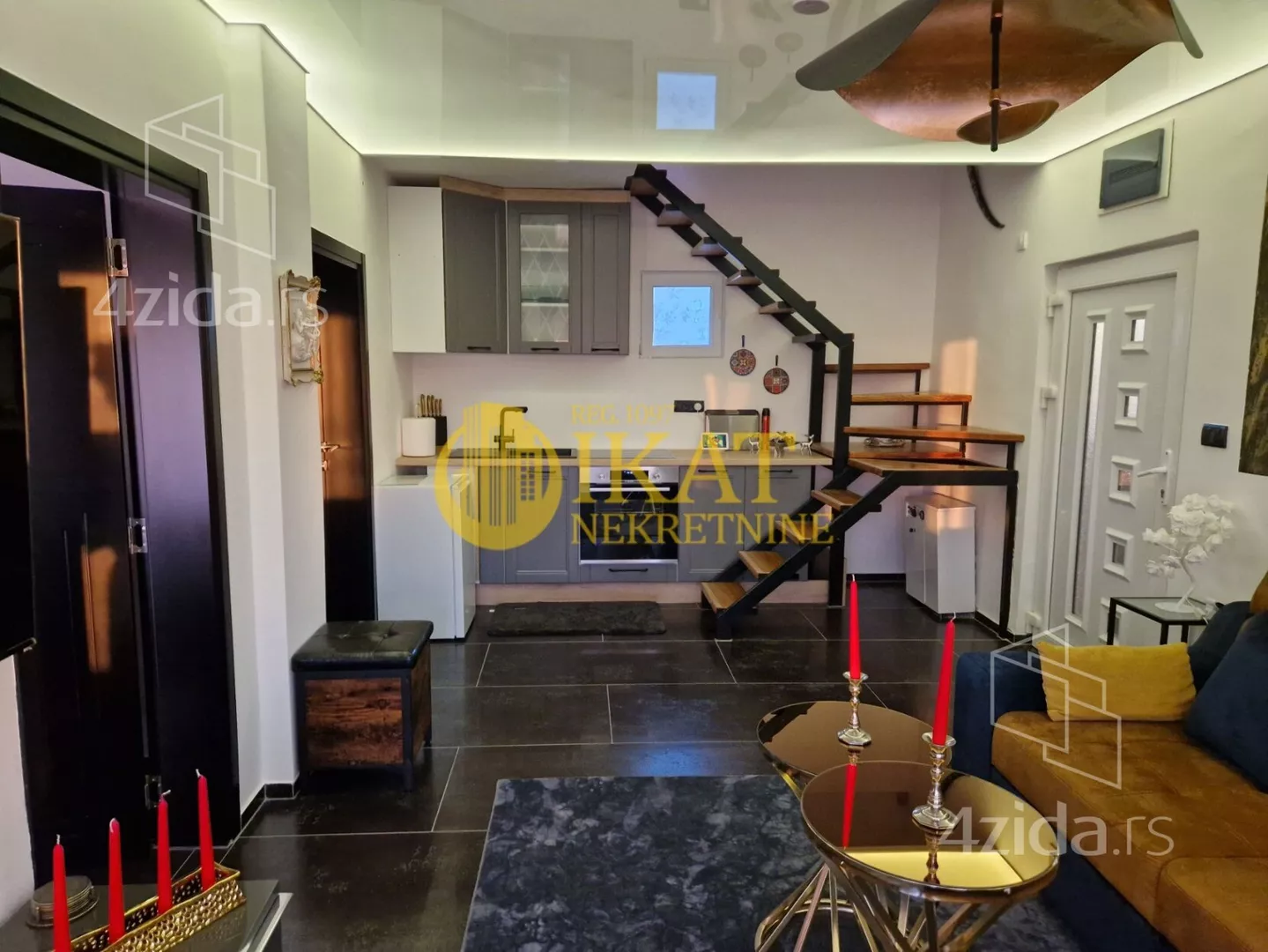 - Na spratu se nalazi dnevni boravak, kuhinja, spavaća soba, kupatilo i velika terasa, na koju se izlazi i iz dnevne i iz spavaće sobe