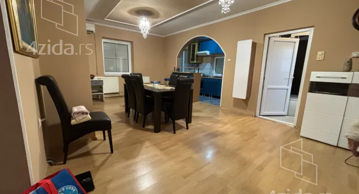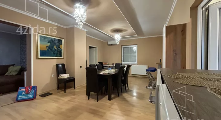 Prednji deo kuće ili kako je mi zovemo stara kuća, građena je od čvrstog materijala, urađena je hidro i termo izolacija, a sastoji se od hodnika (predsoblja) zatim kupatila sa đakuzi kadom i tuš kabinom, dve spavaće sobe, jedna velika dbevna i trpezarija sa kuhinjom. Ovaj prednji deo kuće je renoviran pre nekoliko godina, urađena je spoljna izolacija i demit fasada. Grejanje je na gas ili struju. Kuća je nameštena i ima skoro sve i nameštaj je uključen u cenu. Korisna površina ovog dela kuće je 72m².