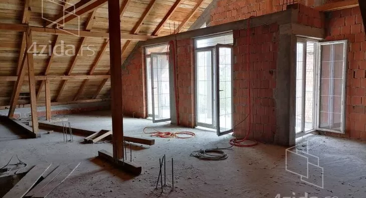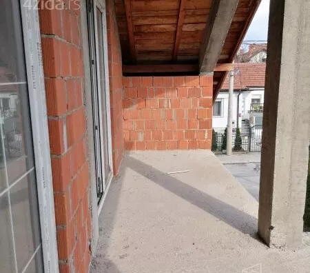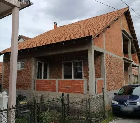 Delimično zavrsena kuća, ozidana,ukrovljena, potpuno postavljena stolarija spoljnja u podrumskom prostoru se nalazi garaza sa rolo vratima, Postoji priključak za gas,izuzetno kvalitetno sazidana,prizemlje,komforan trosoban stan,sprat-bez pregradnih zidova,postoji urbanistička i građevinska mogućnost podizanja jos jednog sprata.