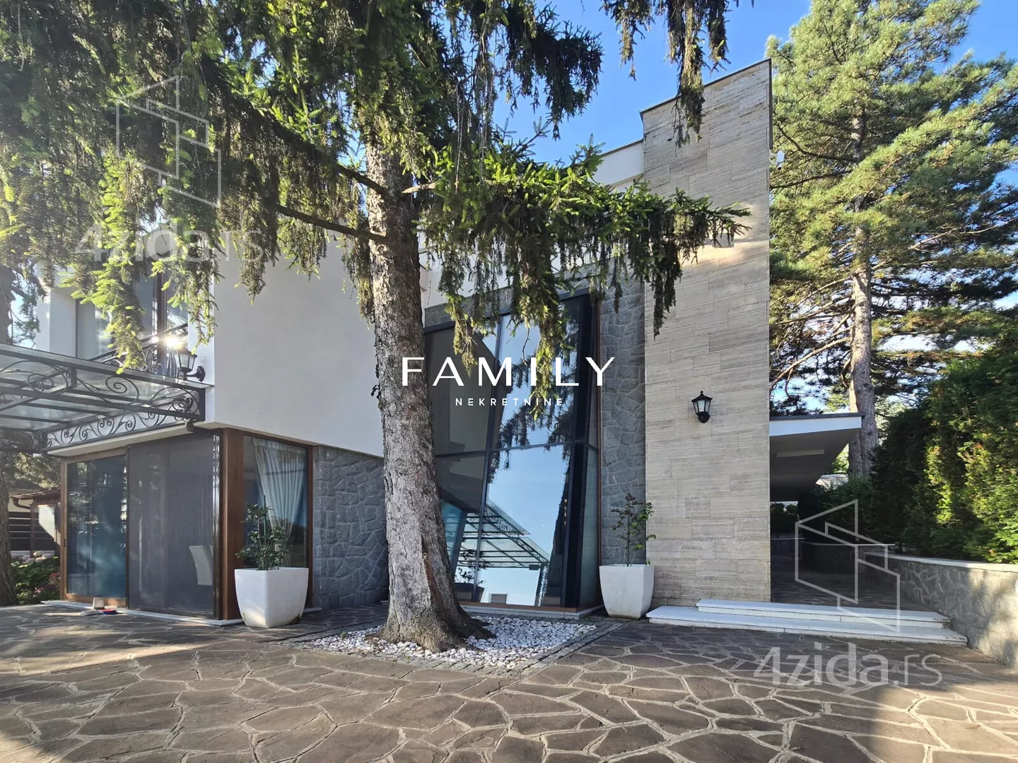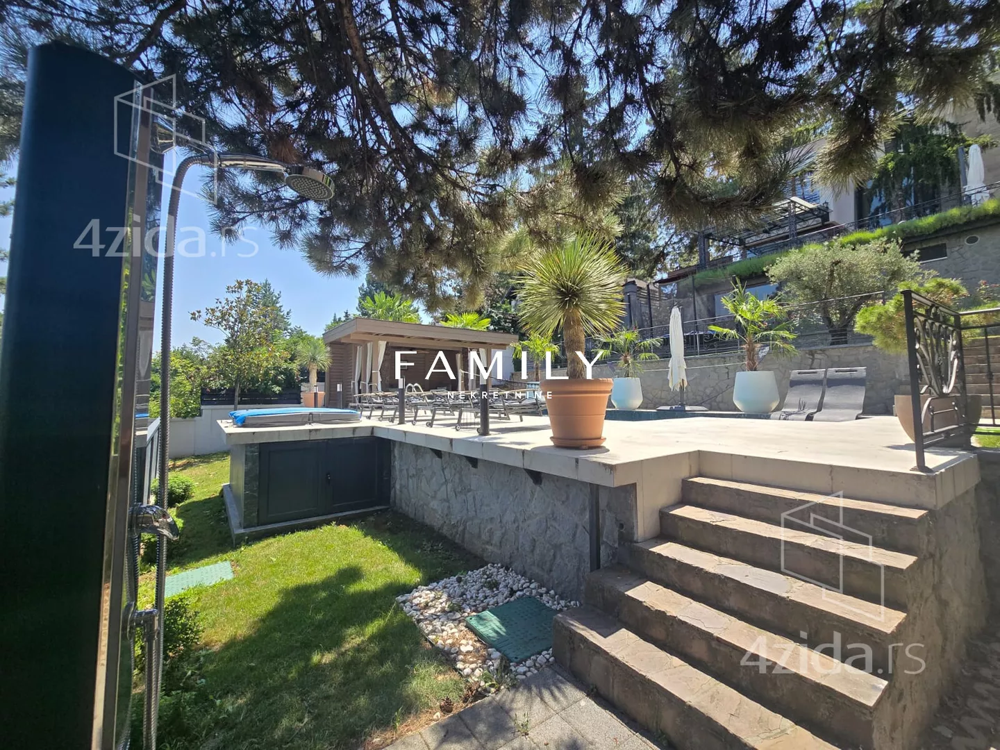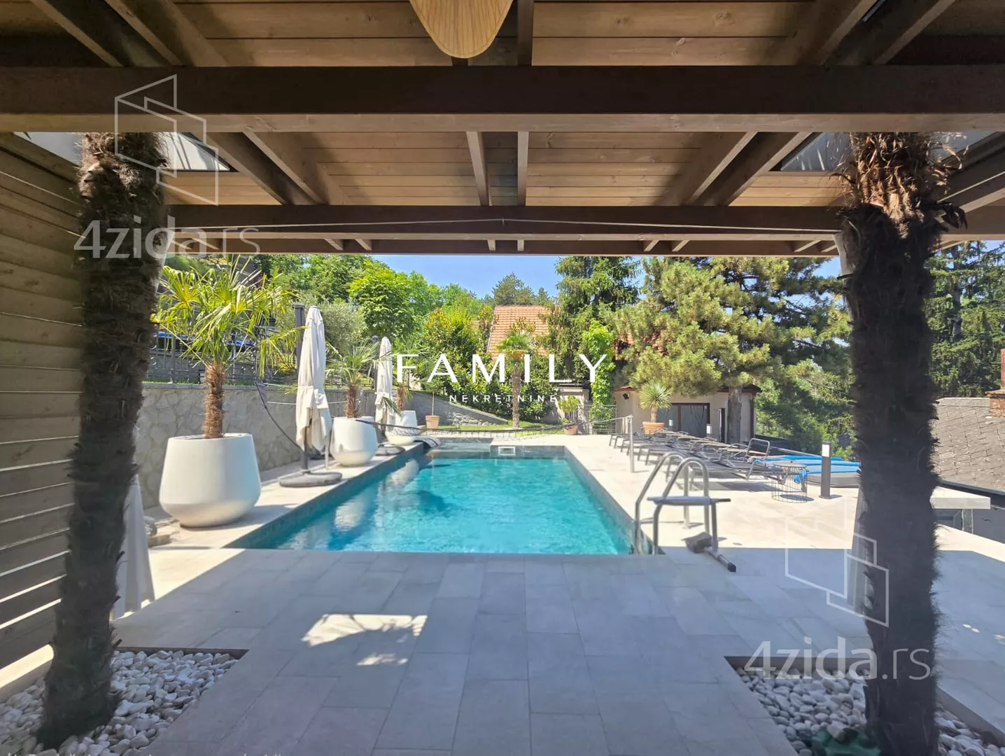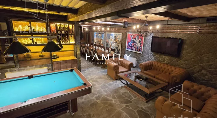Ukupna površina objekta je blizu 400 m², sa dodatnim sadržajima: teretana, bazen, sauna. Zbog visoke ograde i bogatog zelenila, kuća je u potpunosti zaklonjena od pogleda.