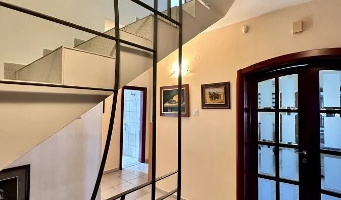 Na donjoj etaži nalazi se open space dnevni boravak sa portalima, sa kojih se pruža prelep pogled na dvorište sa bazenom, odvojena kuhinja, dve odvojene komforne spavaće sobe i jedan sanitarni čvor.