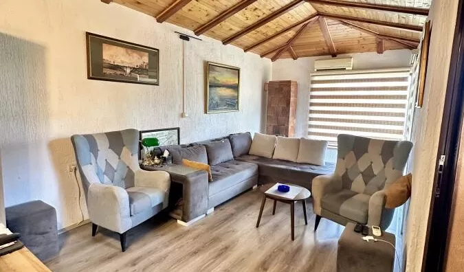 Kuća je organizovana na dve etaže, pažljivo osmišljene da pruže udobnost i funkcionalnost. Donji nivo objedinjuje životni prostor u otvorenom konceptu, sa dnevnim boravkom, kuhinjom i trpezarijom, dok je dodatni mir obezbeđen spavaćom sobom i sanitarnim čvorom. Gornja etaža pruža privatnost kroz dve komforne spavaće sobe i dodatno kupatilo. Celokupan enterijer odiše toplinom doma, dok dvorište sa natkrivenim terasama poziva na opuštanje, druženje i uživanje u prirodi tokom cele godine. Grejanje na čvrsta goriva omogućava ugodnu atmosferu i tokom najhladnijih dana.