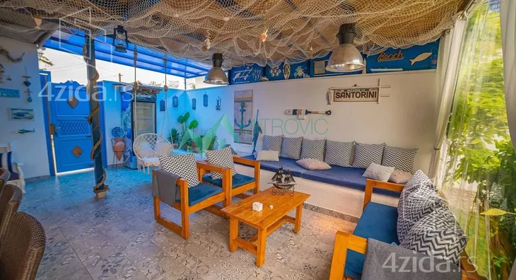 Napolju možete uživati na terasi od 40 m² koja se direktno povezuje sa kuhinjom, savršena za porodična okupljanja. Postoji još jedan terasa na kojoj se nalazi đakuzi i ima prelep pogleda na prirodu. Bazen dimenzija 4x8 m i roštilj pružaju idealno mesto za porodično okupljanje. Pored bazena se nalazi plato sa ležaljkama i mala kamena plaža, gde možete uživati u suncu od izlaska do zalaska.