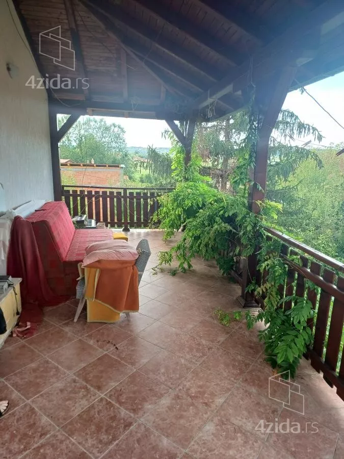 Uknjižena, održavana kuća na dva nivoa. U dvorištu i pomoćni objekat izgrađen kao pmoćni stambeni sa ođakom i kupatilom (trenutno nije u funkciji stanovanja već se koristi za držanje alata i raznih stvari). Neto površina kuće 186m2 a bruto 220m2. Pomoćni objekat neto 63m2, bruto 80m2. Plac 10ari. U blizini kuće i jedna posebna parcela (šuma) od 12ari. Oko 100m do asfaltnog puta i oko 1 km do Kragujevačkog puta. U prizemom delu veliki dnevni i kuhinjsko trpezarijski deo., terasa, malo kupatilo i garža. Na spratnom delu 5 soba, hodnik i kupatilo i prelepa, velika terasa.
