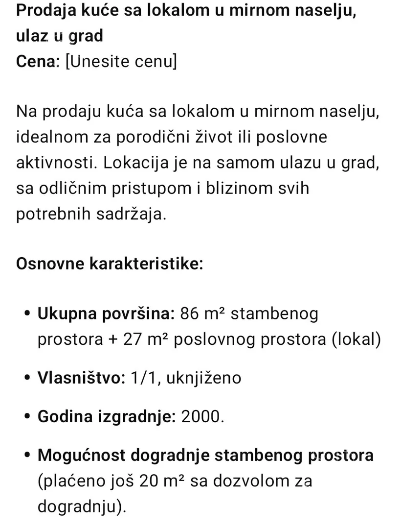 Prelepa kuća na glavnom putu, odmah useljiva. Na placu i poslovni prostor, trenutno pod kirijom. Ova kuca nudi mnoge mogucnosti. Ako zelite svoj mir, a u gradu ste, apsolutna sva infrastruktura, sve uknjizeno, vlasnistvo 1/1. Retka prilika! Prodaje vlasnik, bez agencije! Na kuci nema nikakvih tereta. Uknjizeno i dodatnih 18 m2 ukoliko neko zeli da dograđuje stambeni deo. Unutra kuca bez ikakvih ulaganja. Pre 2 godine zamenjena stolarija j prizemlju i renovirano kupatilo. Uradjena velika klizna kapija visine 2 metra. Plac ima izlaz na dve ulice. U kuci ostavljamo kompletnu kuhinju sa aparatima, a ukoliko kupac zeli i ostatak namestaja uz dogovor. Plac ogradjen zivom ogradom i zicom sa tri strane. Grejanje na gas! Vase je samo da unesete kofere i osetite toplinu jednog pravog doma. Ukoliko ste zainteresovani, rado cemo vam pokazati kucu. Srecna kupovina! Na 3 minuta od kuce posta, dom zdravlja, autobuska stanica, vrtic, crkva. Naselje ima apsolutno sve za lep i udoban zivot.
