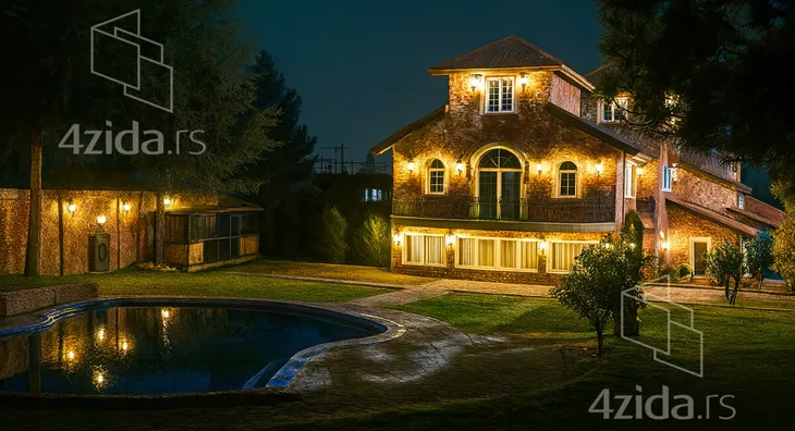Dvorište ove vile odiše jedinstvenim šarmom – od pažljivo osmišljenog osvetljenja, preko reprezentativnih fontana, do dekorativnih staza koje noću dobijaju posebno romantičan karakter zahvaljujući sofisticiranoj rasveti oko bazena i vrtnih elemenata.