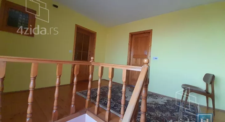 Na spratu se nalazi velika dnevna soba sa špajzom, dve sobe, kupatilo, terasa. Stolarija je drvena, podna obloga parket.