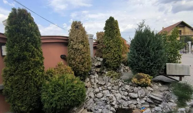 Prostrano dvorište sa ulaznim delom od behaton ploča i sa uređenim travnjakom.