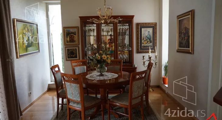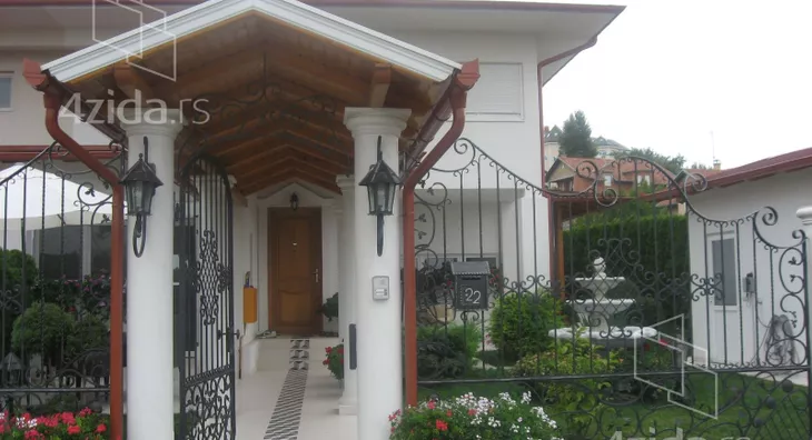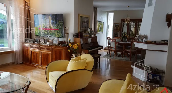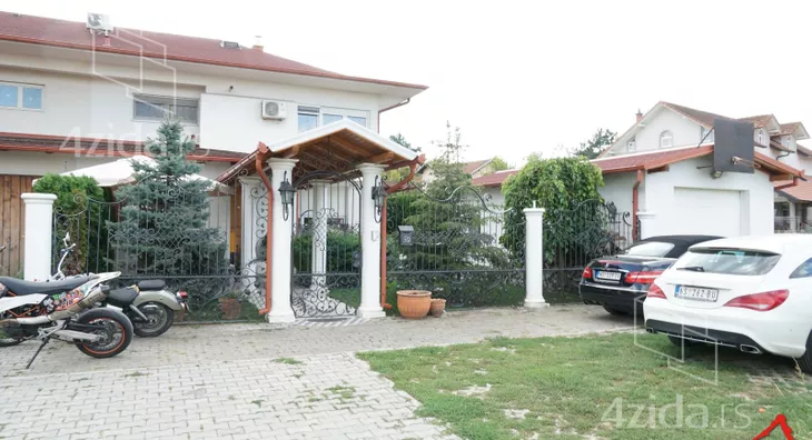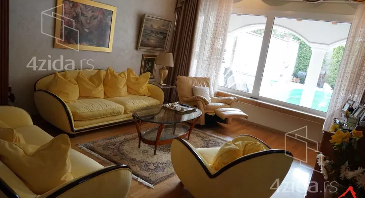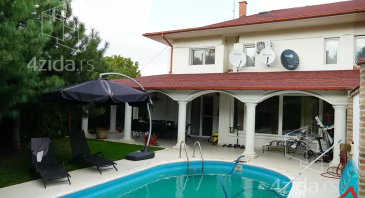 na trem i bazen . Predivno dvoriste iz dva dela: prednje dvorište u zelenilu s dva mesta za uživanje i zadnje dvorište s velikim tremom i bazenom. U svakom trenutku garantovana hladovina na najmanje dva od ova tri mesta u dvoristu! Garaža i 5 (pet) parking mesta. .Dvojna kuća pri čemu druga polovina nije useljena.Prizemlje: Dnevna soba s kaminom i