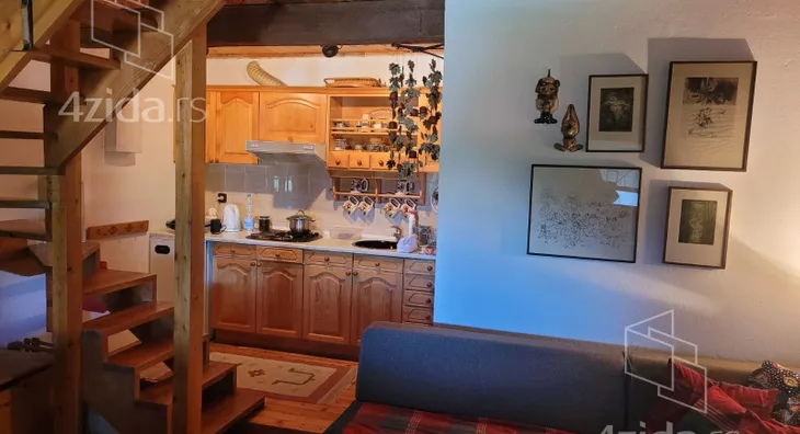 I nivo - dnevna soba sa kuhinjom, kupatilo, vetrobran (koristi se kao ostava i spremište za drva), terasa