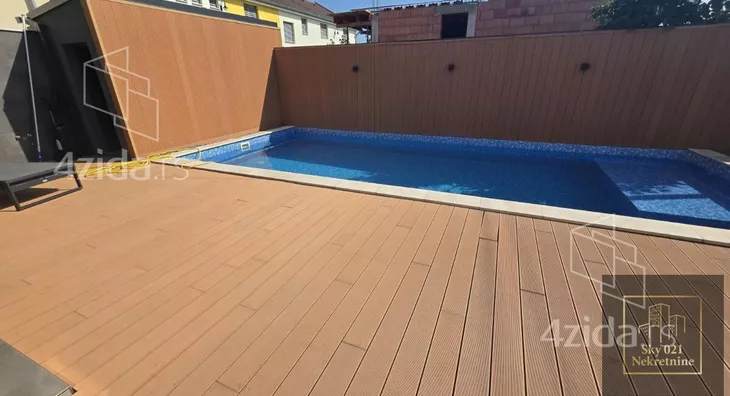 Eksterijer je jednako promišljen kao i enterijer. Umesto klasičnog travnjaka, fokus je na uređenom dvorištu sa bazenom i pomoćnim objektom za tehniku – čisto, precizno, funkcionalno. Sve je podređeno stilu života koji ne trpi suvišno.