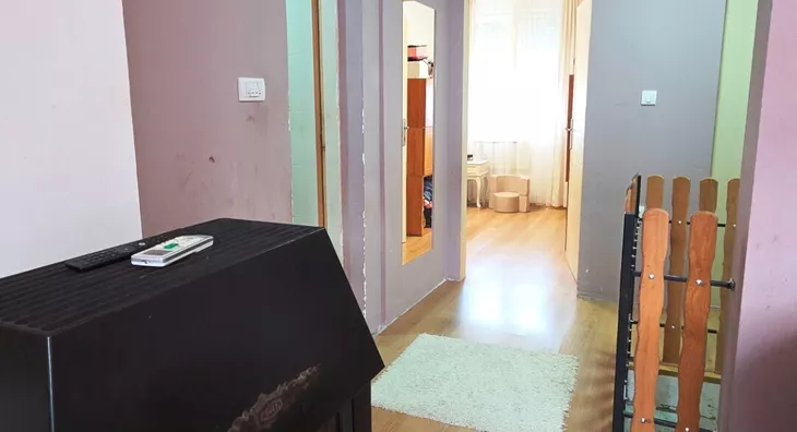 Stepeništem, ukoliko se ukloni deo gipsanog zida, može se iz kuće popeti na gornju etažu u potkrovlju. Trenutno se koristi zaseban ulaz. Iz hodnika se ulazi u veliki dnevni boravak sa prostranom kuhinjom i trpezarijom koji gledaju na ulicu, a dve spavaće sobe gledaju na dvorište. Kupatilo je veliko i završeno. Jedna soba je u završnoj fazi.