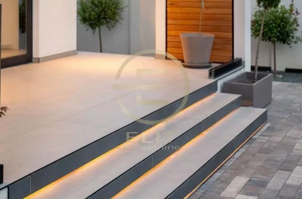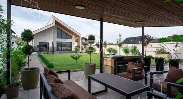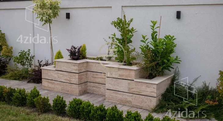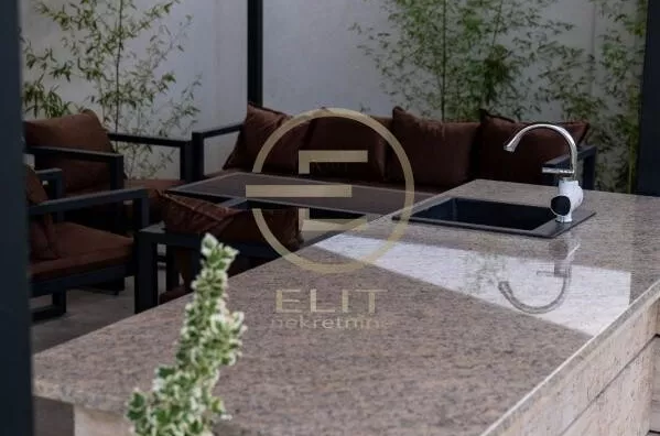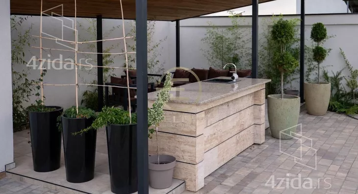 U dnu dvorišta, smeštena je natkrivena, izolovana terasa sa garniturom za sedenje i šankom obloženim prirodnim kamenom.
