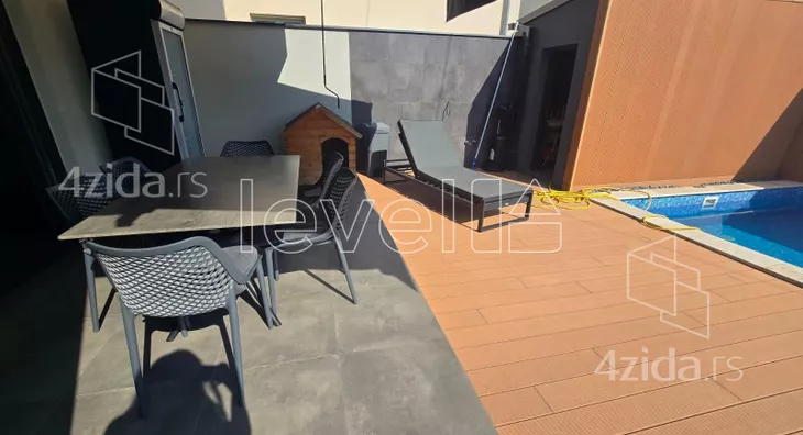 Eksterijer je jednako promišljen kao i enterijer. Umesto klasičnog travnjaka, fokus je na uređenom dvorištu sa bazenom i pomoćnim objektom za tehniku – čisto, precizno, funkcionalno. Sve je podređeno stilu života koji ne trpi suvišno.