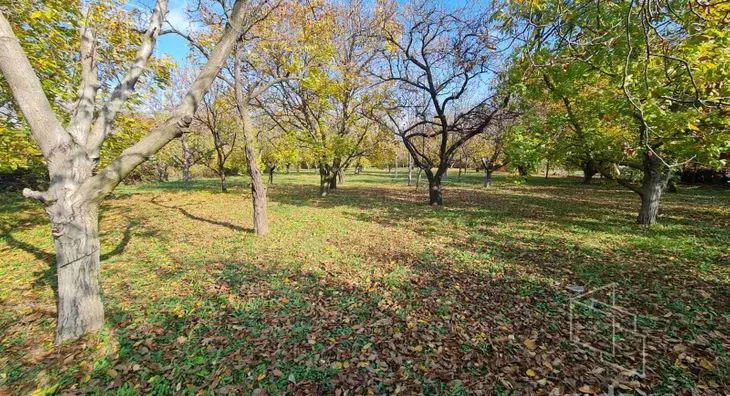 Этот просторный участок шириной 38 м украшен рядами грецких орехов и различными фруктовыми деревьями, создавая приятную природную атмосферу. Благодаря расположению на легком плато, земля преимущественно ровная, что упрощает будущие проекты и строительство.