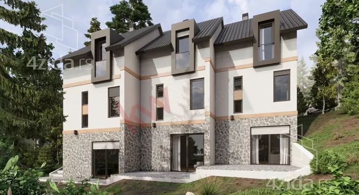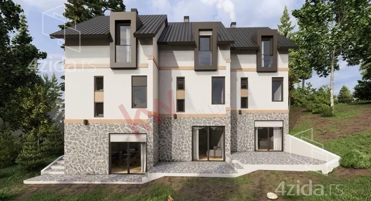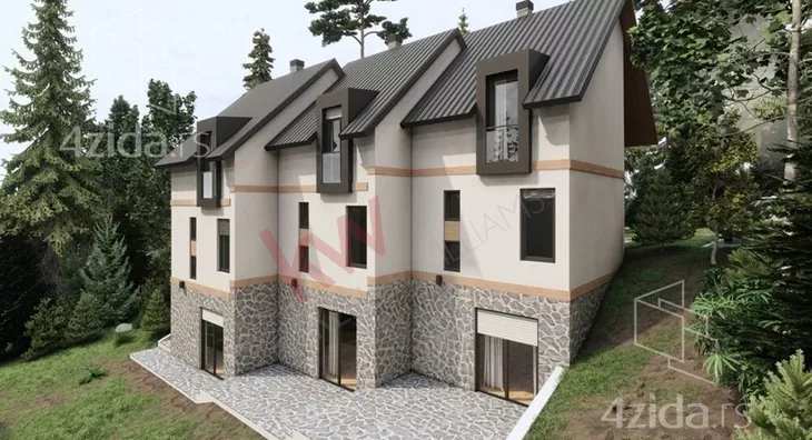 - Prizemlje: dnevni boravak sa kaminom i panoramskim staklenim vratima, kuhinja sa trpezarijom i kupatilo sa kadom i pogledom na četinarsku šumu