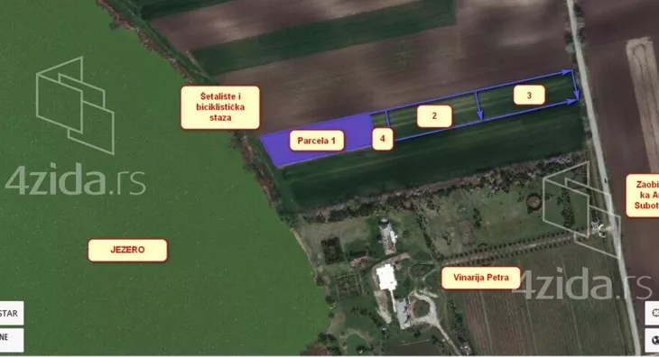 Subotica – Palić, prodaje se gradsko građevinsko zemljište ukupne površine od 14271 kvm, u blizini Vinarije Petra, pri obali Palićkog jezera i prostire se do zaobilaznog puta. Sastoji se od četiri parcele: P.B.r. 1 - 4823 kvm, P.B.r. 2 - 4386 kvm, P.B.r. 3 - 4387 kvm i P.B.r. 4 - 675 kvm (predviđeno za put). Odlična lokacija za investiciju izgradnje turističko - stanbeno, ugostiteljskog objekta! Postoji mogućnost kupovine pojedinačnih parcela uz dogovor. Takođe je moguća kompenzacija za adekvatne nekretnine. Za ozbiljnog kupca moguća i ozbiljnija korekcija cene! Papiri su uredni, vlasništvo 1/1. Red. br. 25-Z2