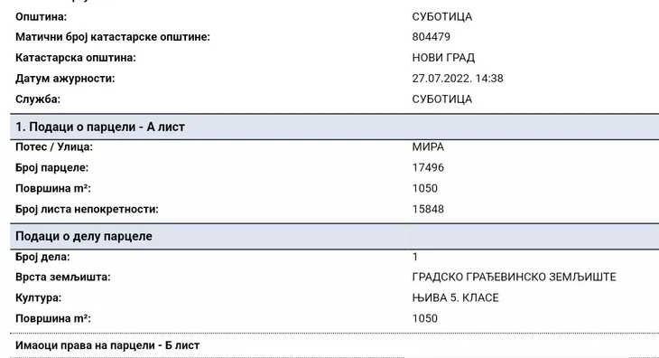 Predmet prodaje je građevinsko zemljište uknjiženo kao privatna svojina vlasnika 1/1, površine 1.050 m2, ulični front 30m x 35m. Br parcele: 17496, K.O. Radanovac. Ulica: Mira br 47.