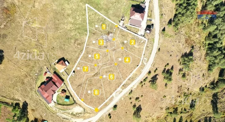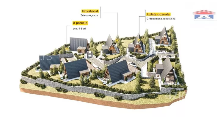 Prodaje se građevinsko zemljište ukupne površine 4200m2 podeljeno na 8 parcela. Idealno pozicionirano, u blizini svih najatraktivnijih lokaliteta Zlatibora. Postoje pripremljeni projekti za 8 kuća (za svaku parcelu) sa lokacijskom, građevinskom i komunalnim dozvolama. Asfaltni prilaz.