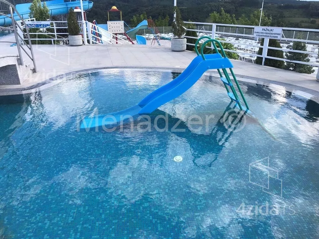 The Aqua Park occupies an area of 2,000 m2, has three outdoor swimming pools, three hydromassage tubs, waterfalls, three slides, a playground for children, a security room and bar. Floor coverings are non-slipery, aesthetically pleasing, and hygienically safe.