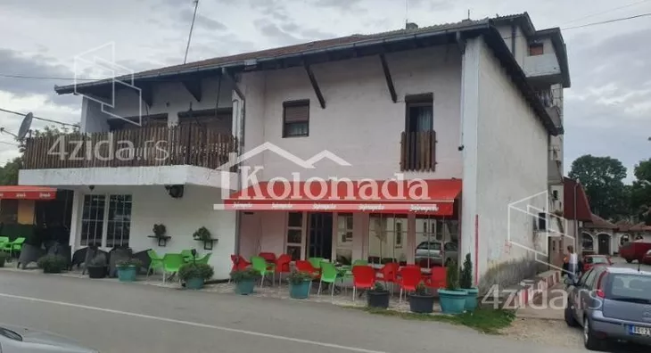 Objekat se nalazi u strogom centru u prometnoj ulici. Sastoji se od Prizemlja i sprata. U prizemlju je kafic, neto povrsine 144 m2, koji ima tridesetogodisnju tradiciju i u radu je, kompletno opremljen inventarom, ima veliki izlog koji gleda na dve ulice i bastu u površini od 110 m2. Lokal ima dva sanitarna čvora, kuhinju i magacin. Sprat je u povrsini od 144 m2, sastoji se od hodnika, kupatila, tri sobe, dnevnog boravka i četiri terase. Sprat se trenutno koristi kao stambeni prostor, a moze da bude i poslovni prostor. Objekat ima etažno grejanje na gas, trofaznu struju, klimu, internet, kablovsku TV, PVC stolariju i izolaciju. Licenca 469. Agencijska provizija je 2%. ,