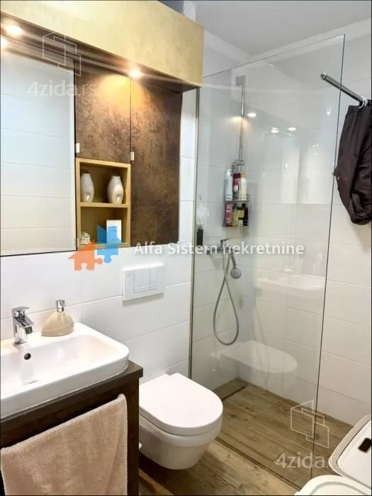 Stan se nalazi na visokom prizemlju (formalno prvi sprat) moderno projektovane zgrade sa recepcijom, obezbeđenjem 24/7, video nadzorom i liftom. Izuzetno je funkcionalno koncipiran - dnevna soba, trpezarija i kuhinja povezani su u otvoren prostor, dok se u odvojenom delu nalaze dve spavaće sobe, od kojih je jedna master sa sopstvenim kupatilom. Stan poseduje i dodatno kupatilo.