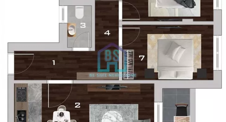 ▪️ Sastoji se od ulaznog hodnika iz kojeg se ulazi u sve prostorije, prostranog dnevnog boravka sa kuhinjom i izlazom na terasu, dve spavaće sobe, toaleta i kupatila.